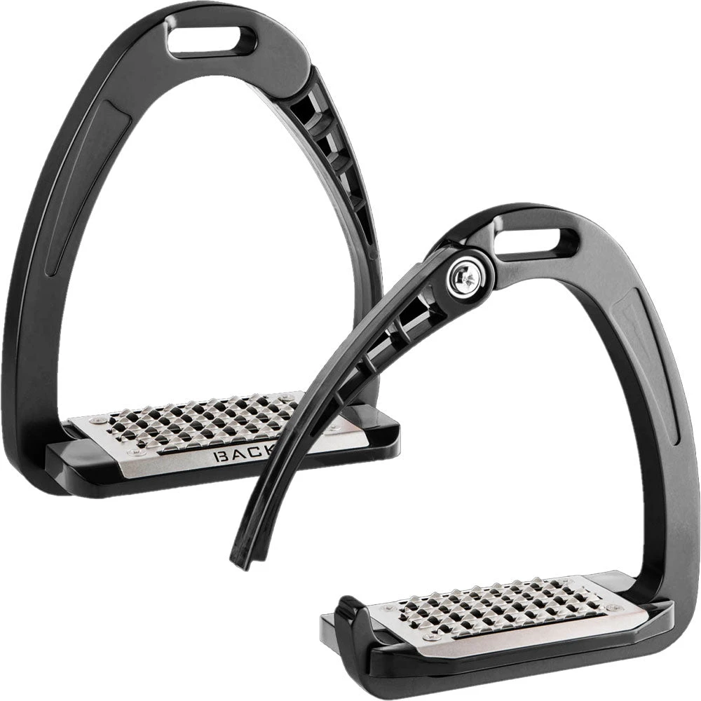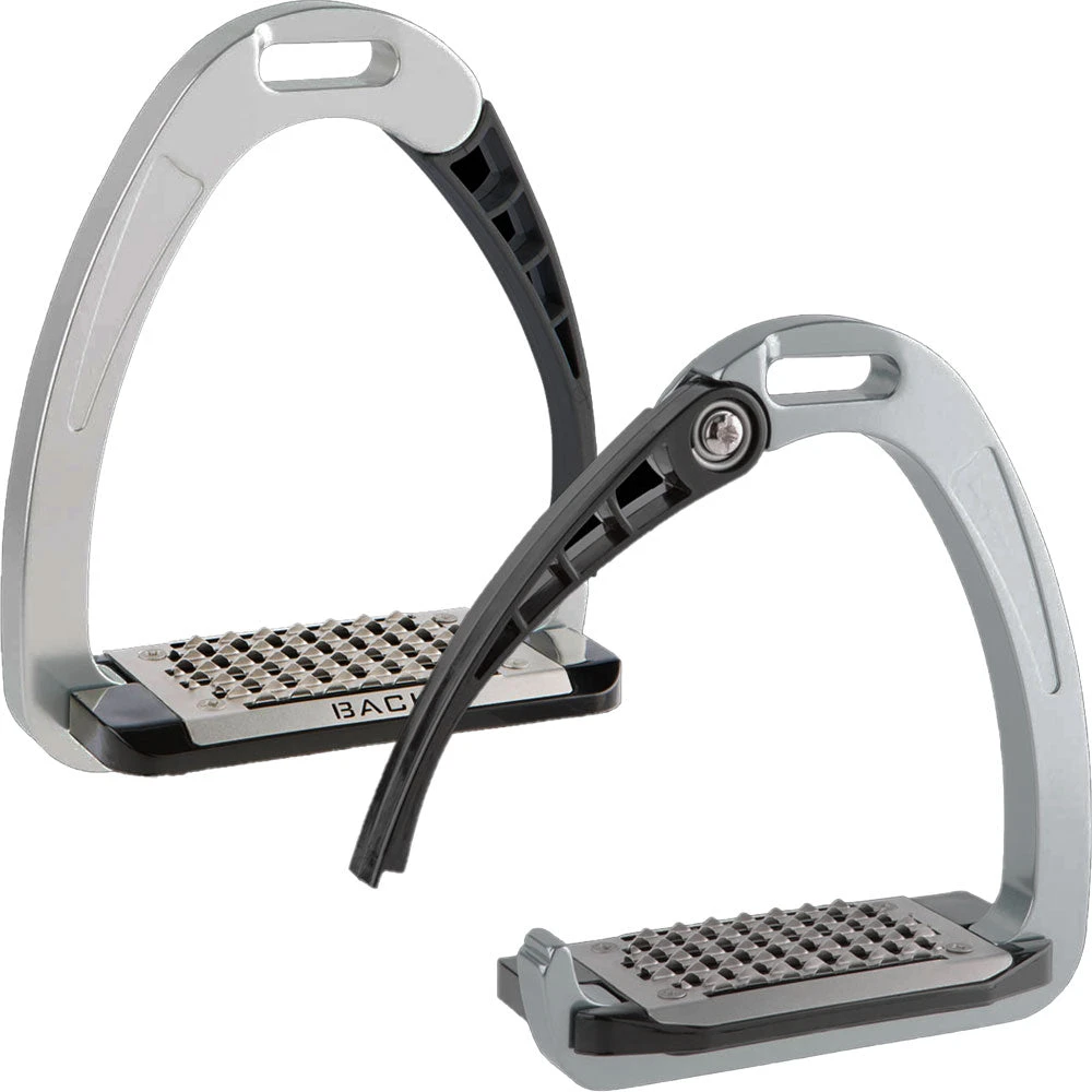 Acavallo Arena Alupro Aluminum Safety Stirrups feature a lightweight aluminum stirrup bow and a polyamide opening arm with a unique stress activated locking and release mechanism that provides a less rigid and more comfortable feel. The springing stirrup bow and foot support effectively absorbs and compensates for sudden impacts exerted through the rider’s weight while posting, jumping or hacking, while the opening arm releasing in case of an emergency.