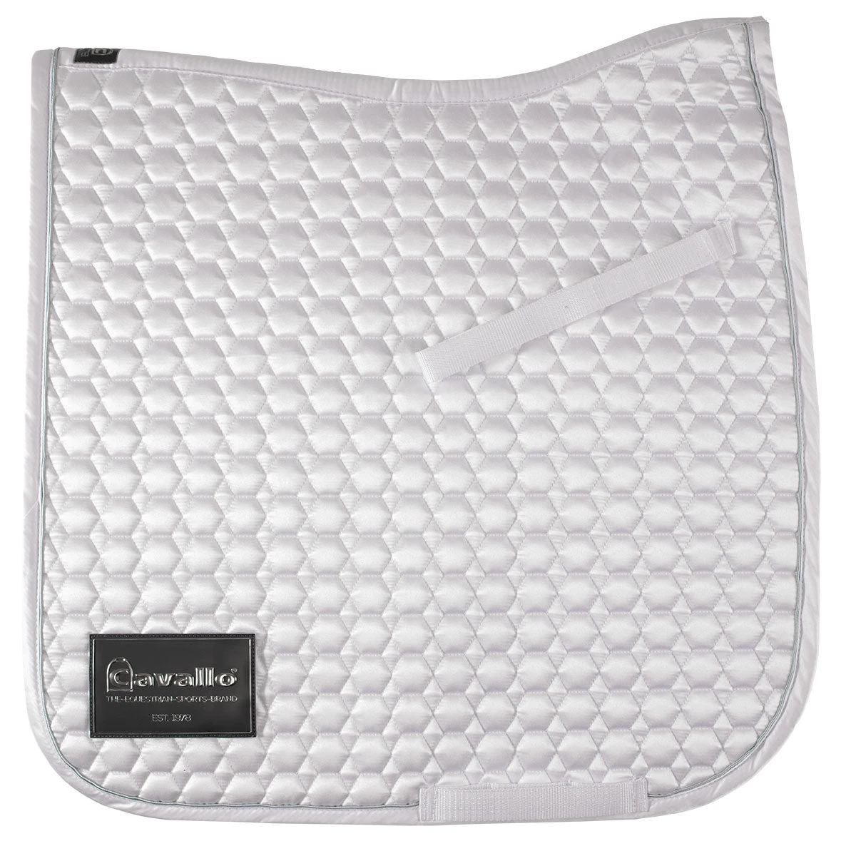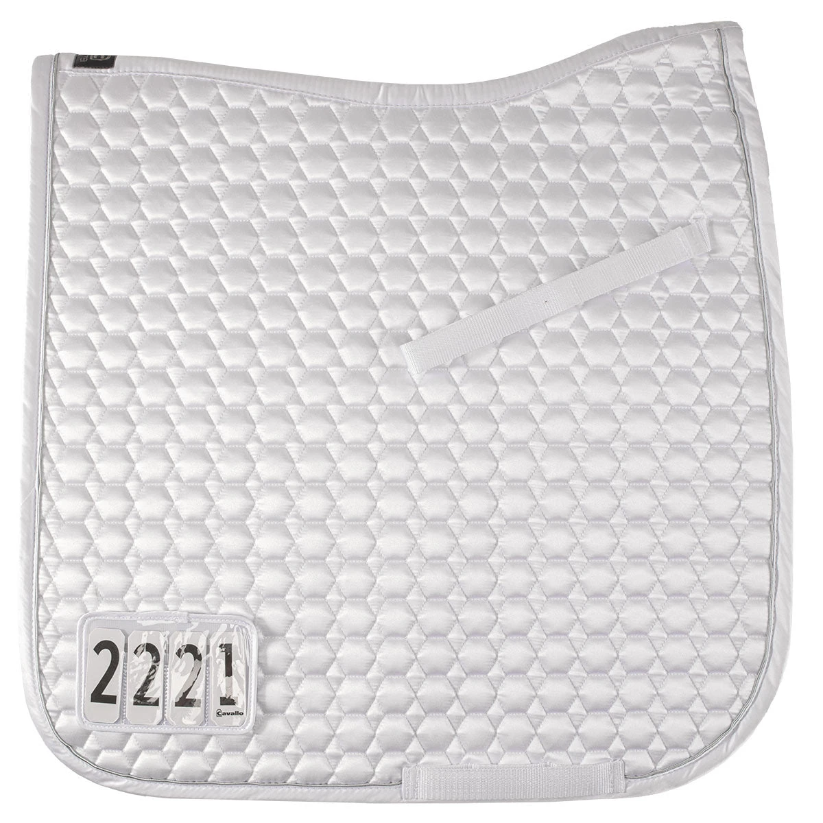 The Cavallo Jolly Dressage Saddle Pad has attractive all over honeycomb quilting and silver piping. A unique fastening system allows one to detach the Cavallo logo patch, and replace it with the included interchangeable number patch. This system is perfect for showing, and allows you to change the number for each show, as well as use the pad for schooling. The pad is quick-drying and moisture wicking with mesh lining and is skin-friendly for the horse.