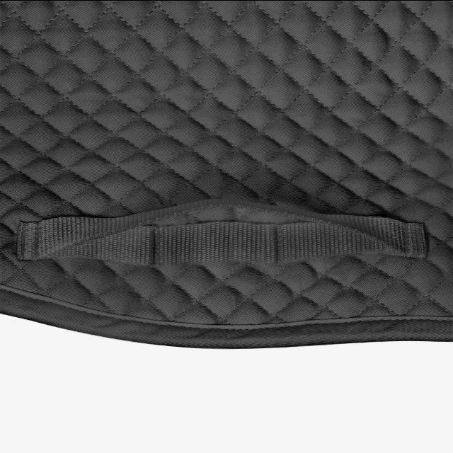 The EquiFit Essential Dressage Pad is anatomically designed to provide superior fit and comfort for your horse – all at an unbeatable price! The innovative wither relief design ensures that the pad stays in place in the gullet of the saddle, away from your horse’s spine and relieving unwanted wither pressure. The durable cotton twill outside looks like new even with extensive use and washing. Slip-resistant flannel on the underside wicks moisture and provides additional anti-slip properties. Dual-density poly-fill construction provides comfort and impact protection. Generously sized, this square pad fits most sizes of saddles, even after washing and is designed to resist the effects of shrinking after regular wash and wear.